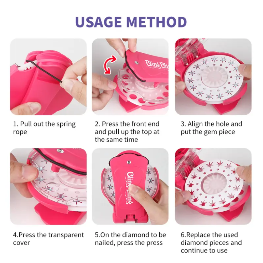 This step guide demonstrates just how easy it is to load gems and press them onto the hair. Each step is designed for kids to follow with ease. No glue, heat, or mess — just press and sparkle.