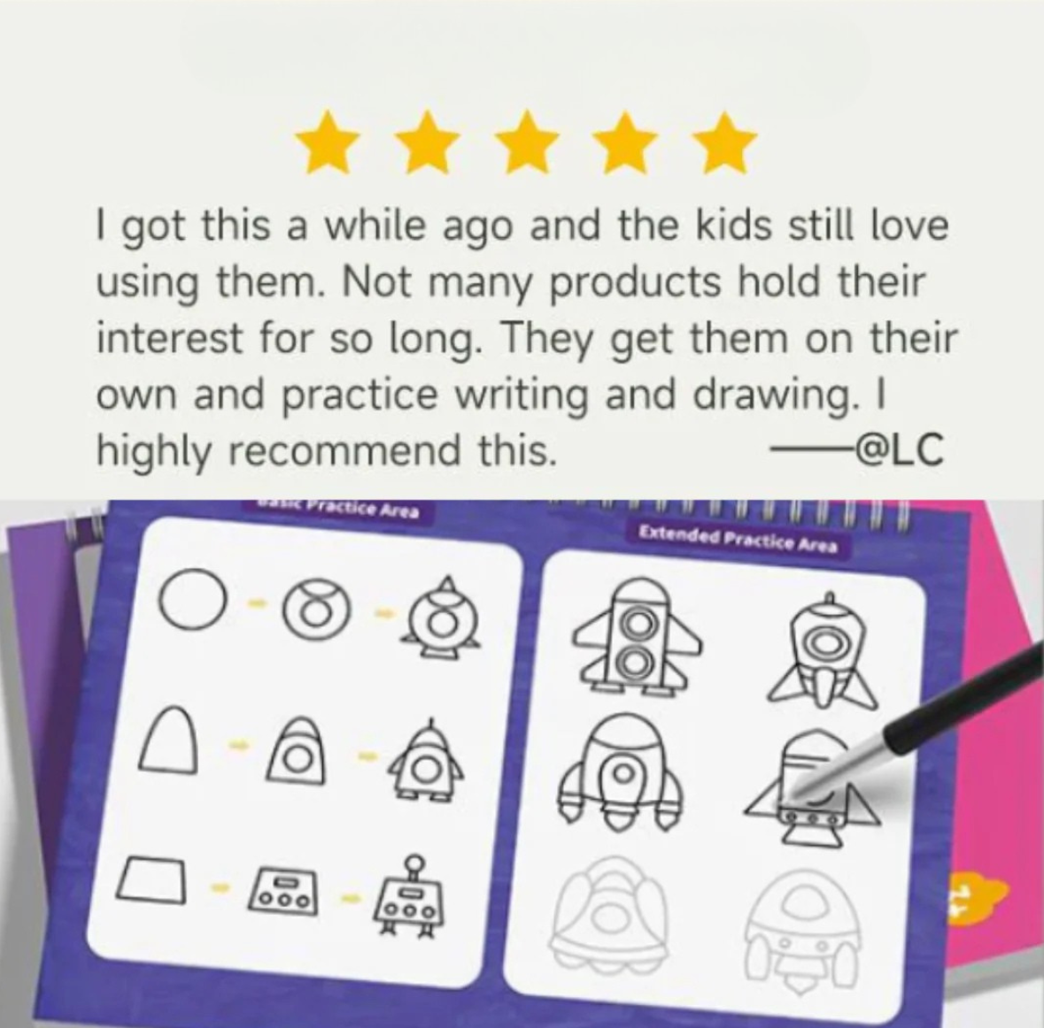The books are designed for kids ages 3–8. Younger children will enjoy tracing and building fine motor skills, while older kids can practice handwriting, spelling, and concentration.