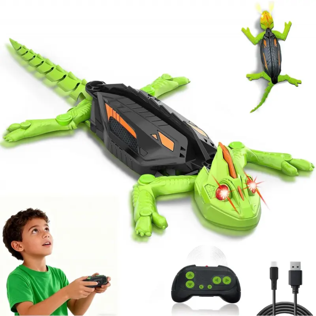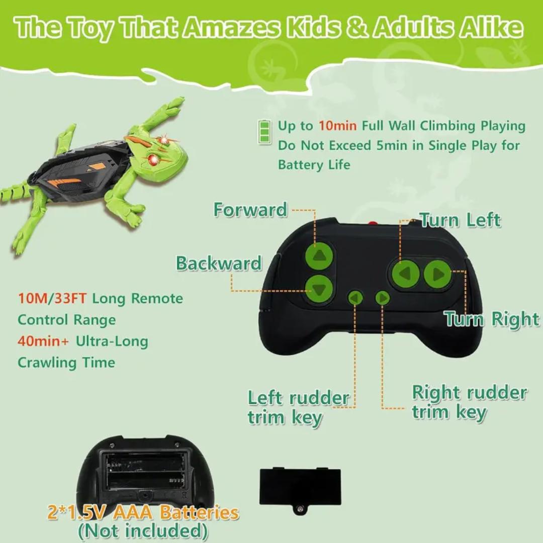 The controller layout is shown clearly—kids can move the gecko forward, backward, left, right, and perform spins. With a 33-ft range and 40+ minutes of crawling time, it’s built for active adventures anywhere in the house.