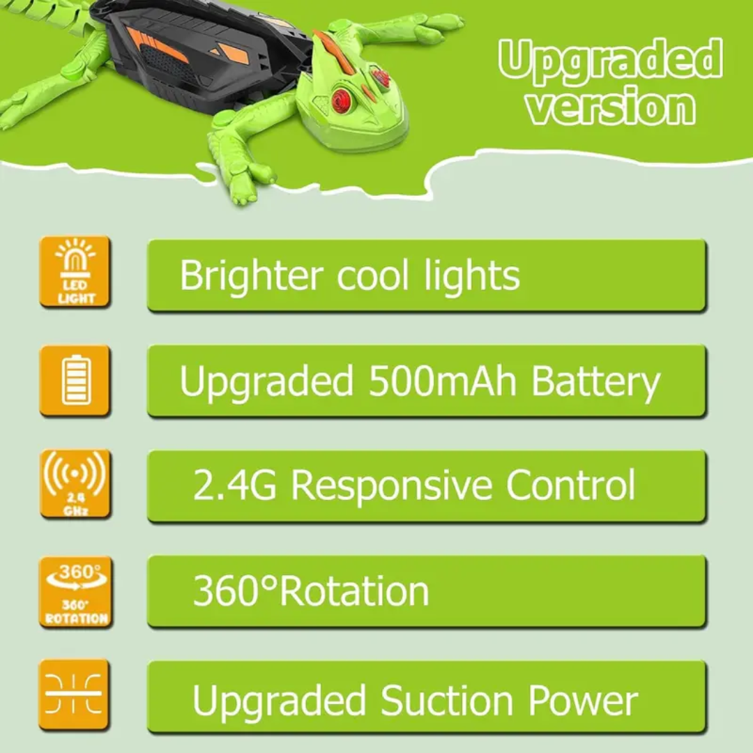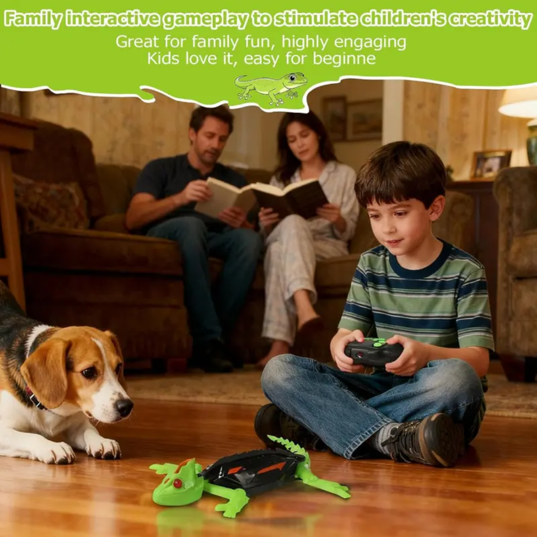 Close-up shots highlight the gecko’s LED-lit eyes, impact-resistant ABS shell, and Type-C charging port. These details reinforce high product quality, durability, and modern features built for long-lasting fun.